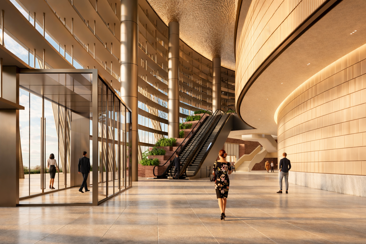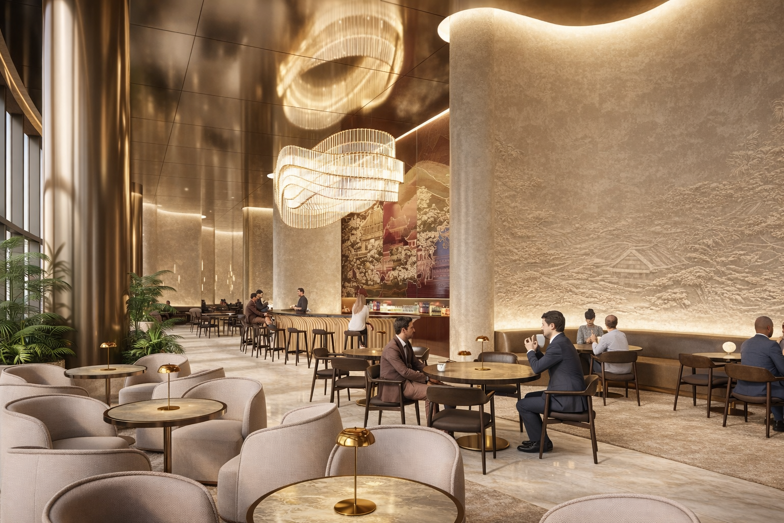 Khi bước vào bên trong, hành trình của huyền thoại tiếp tục được kể bằng ngôn ngữ nội thất, nơi mỗi không gian là một chương, mỗi trải nghiệm là một lớp cảm xúc. Không gian tầng 1 mở ra hành trình như bước vào lòng ngọc trai, một biểu tượng của Phú Quốc, với những vòm cong mềm mại bao bọc lấy không gian, ánh sáng dịu nhẹ gợi hiệu ứng như bề mặt ngọc trai đầy thanh lịch.