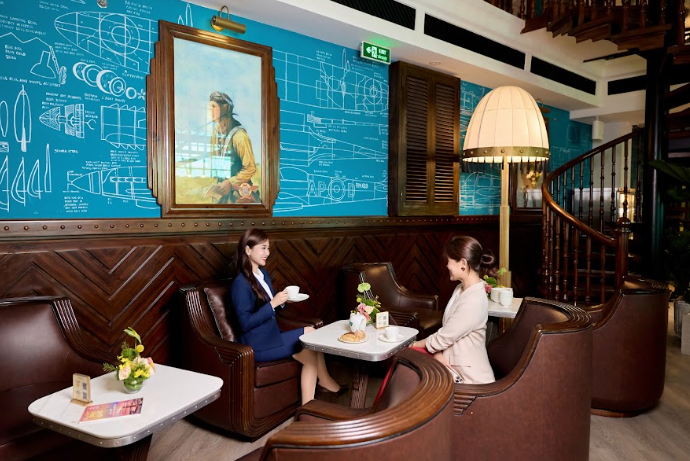 Mọi chi tiết được sắp đặt để khi thả mình trên những bộ sofa da nâu bản lớn, nhâm nhi một tách trà TWG, hành khách có thể trở về quá khứ tận hưởng một không gian cổ điển, sang trọng và dần khám phá những câu chuyện về ngành hàng không theo một cách truyền tải nhẹ nhàng, đầy thú vị.