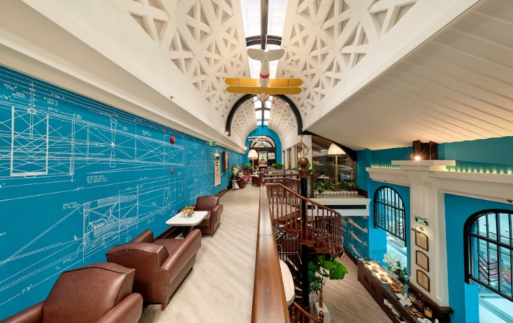 Các mảng tường phủ kín những phác thảo kỹ thuật máy bay, động cơ bằng nét phấn. Những bức họa nghệ thuật được Bill Bensley đích thân tuyển chọn, khắc họa hình ảnh những phi công thời kỳ đầu trong trang phục mũ da, kính bảo hộ và áo khoác măng tô.